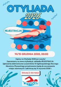 Zgłoszenia elektroniczne uczestników XI Ogólnopolskiego Nocnego Maratonu Pływackiego przyjmowane będą do wyczerpania miejsc startowych i zakończą się 31 stycznia 2026 r.
