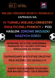 25 stycznia po raz czwarty organizujemy TURNIEJ WIELKIEJ ORKIESTRY ŚWIĄTECZNEJ POMOCY. Odbędzie się on pod balonem na ulicy Zielonej. Zapraszamy drużyny piłkarskie (zawodnicy od 18 roku życia)- kluby, stowarzyszenia oraz dzikie drużyny. Podczas wydarzenia odbędą się liczne licytacje oraz konkursy. Zapisy ruszają w poniedziałek 8 grudnia. Aby zapisać drużynę trzeba wysłać smsa pod numer 509 614 065. Wpisowe od zawodnika wynosi 20 zł (cały dochód wrzucony będzie do puszki podczas turnieju).