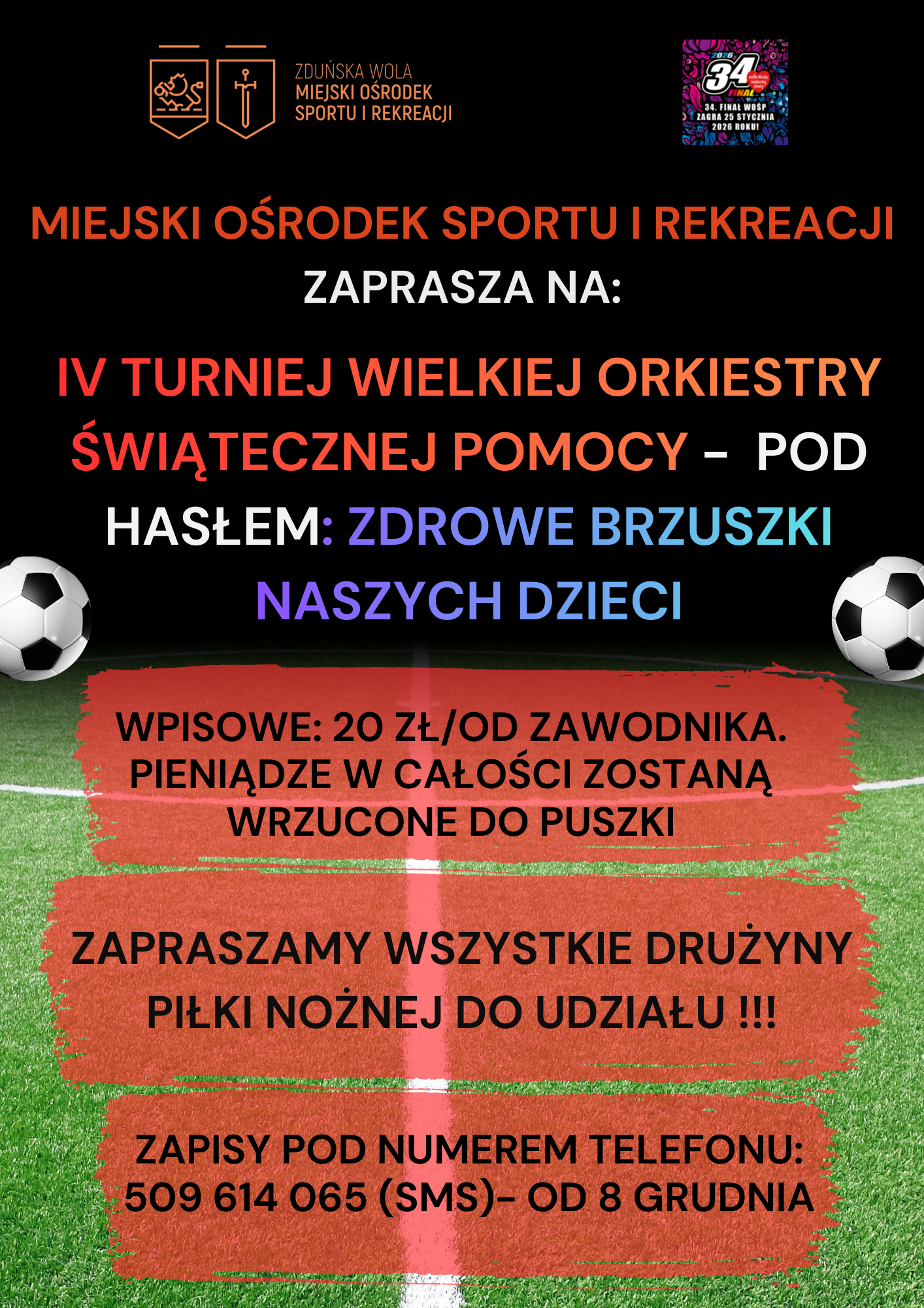 25 stycznia po raz czwarty organizujemy TURNIEJ WIELKIEJ ORKIESTRY ŚWIĄTECZNEJ POMOCY. Odbędzie się on pod balonem na ulicy Zielonej. Zapraszamy drużyny piłkarskie (zawodnicy od 18 roku życia)- kluby, stowarzyszenia oraz dzikie drużyny. Podczas wydarzenia odbędą się liczne licytacje oraz konkursy. Zapisy ruszają w poniedziałek 8 grudnia. Aby zapisać drużynę trzeba wysłać smsa pod numer 509 614 065. Wpisowe od zawodnika wynosi 20 zł (cały dochód wrzucony będzie do puszki podczas turnieju).